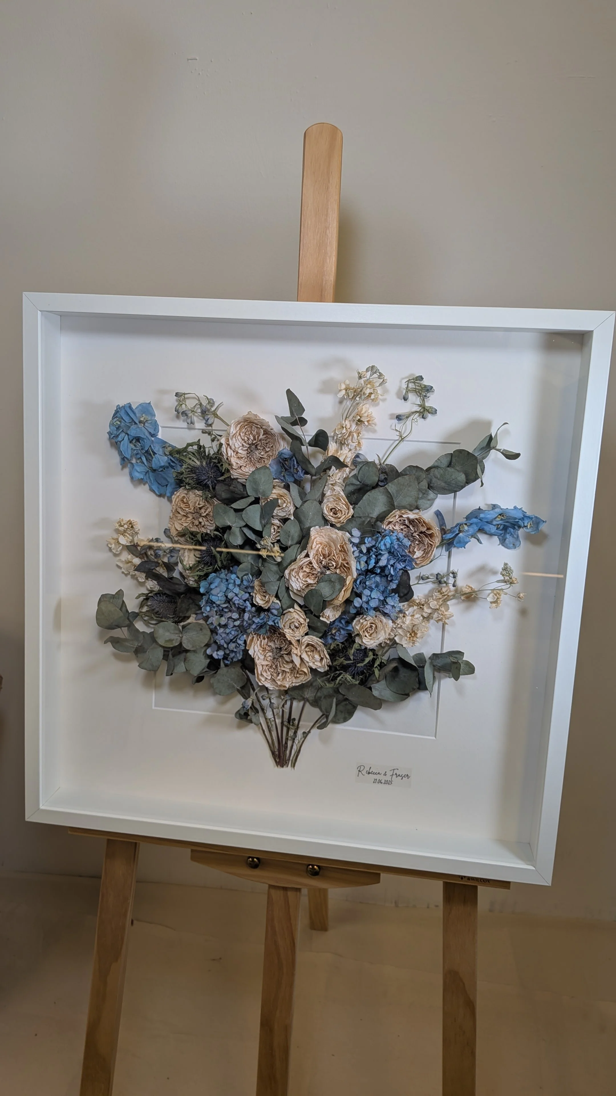 In this wooden shadow box, we can recreate your wedding bouquet exactly how it was on your Big Day, with adding details if you wish like the invitation or a photograph. The size of the frame is 50x50cm and comes in 4 different colours. You can choose the frame to be personalised or not. We personalise by adding a clear vynil sticker to the frame mount. The frame can also include the ribbon. Please mention at check-out.